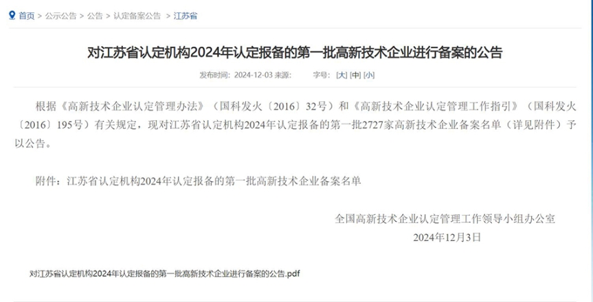 12月3日,,,,,天下高新手艺企业认定管理事情向导小组办公室正式通告了江苏省2024年认定报备的第一批高新手艺企业备案名单,,,,,bet9九州酷游(以下简称“bet9九州酷游”)依附其在手艺立异、知识产权、产品研发及转化等方面的卓越体现,,,,,再次乐成获得国家高新手艺企业资质认定,,,,,证书编号为GR202432000848。。。。。。。。